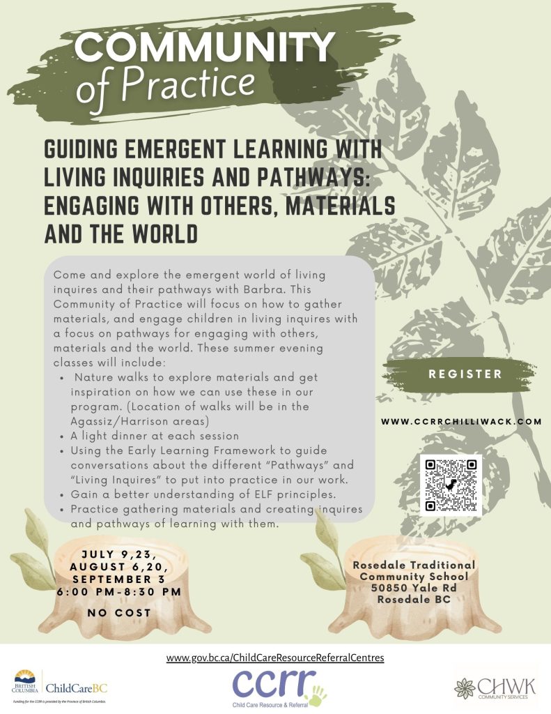 Come and explore the emergent world of living inquires and their pathways with Barbra. This Community of Practice will focus on how to gather materials, and engage children in living inquires with a focus on pathways for engaging with others, materials, and the world. These summer evening classes will include: