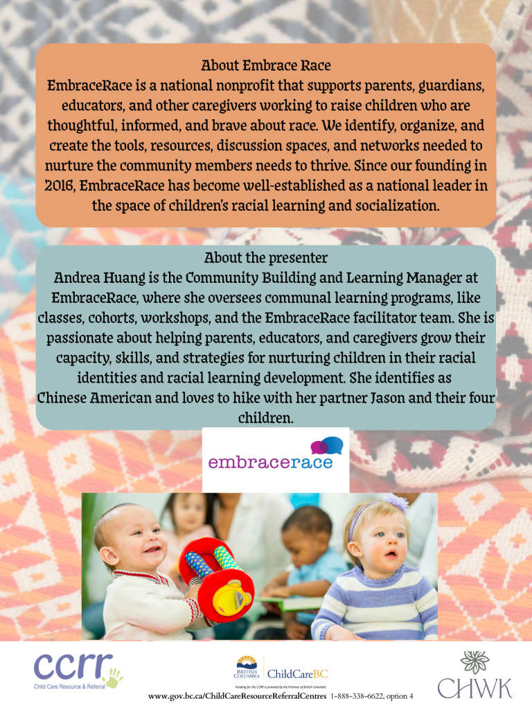 Join us for an interactive, virtual, 2-session workshop focused on the racial learning and development of young children, ages 0-2 yrs (Day 1) and 3-5 yrs (Day 2). Participants will deepen their knowledge and understanding of what research shows us about infant-toddler and preschoolers’ growth and what they notice about race.