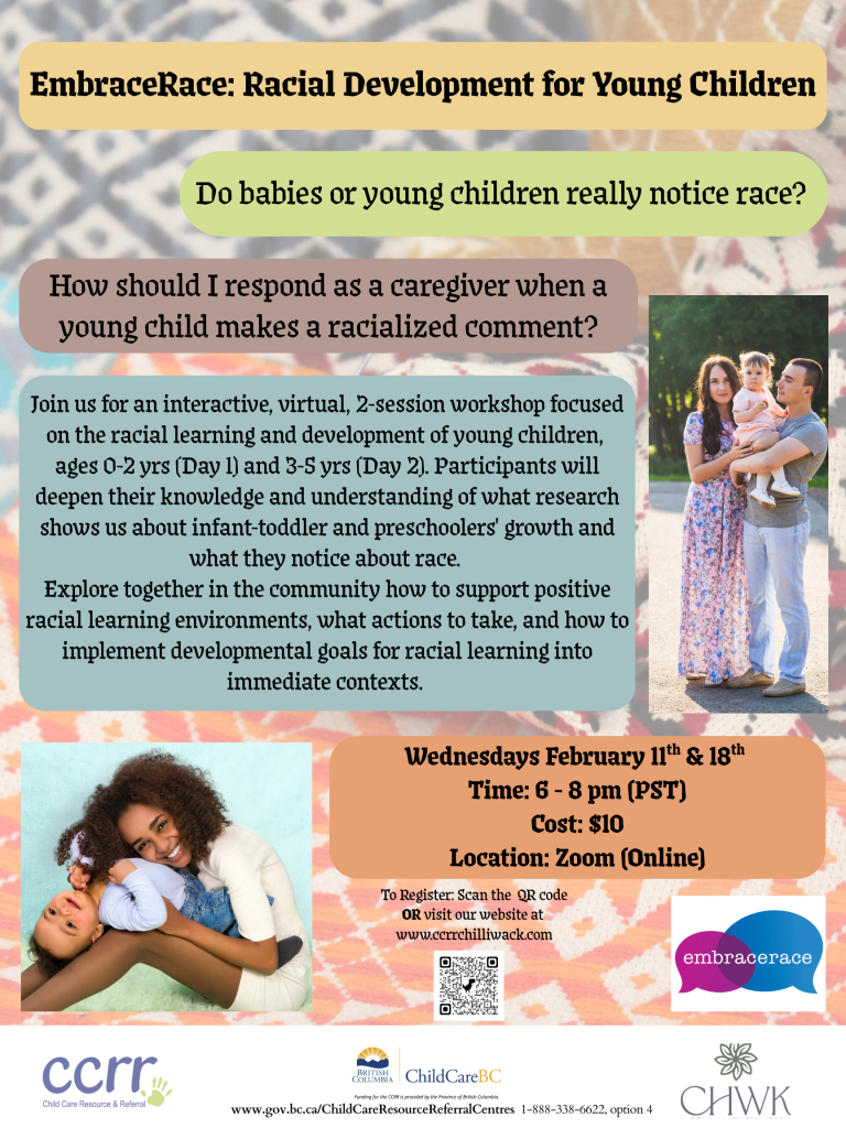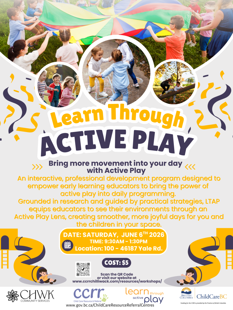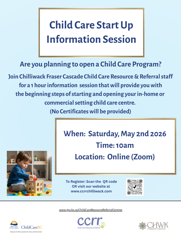 Join Chilliwack Fraser Cascade Child Care Resource & Referral staff for an hour’s information session that will provide you with the beginning steps of starting and opening your in-home or commercial setting child care center.(No Certificates will be provided) Cost: Free REGISTER ONLINE When & Where: Saturday February 28, 2026 – 10:00am – 11:00am Online […]