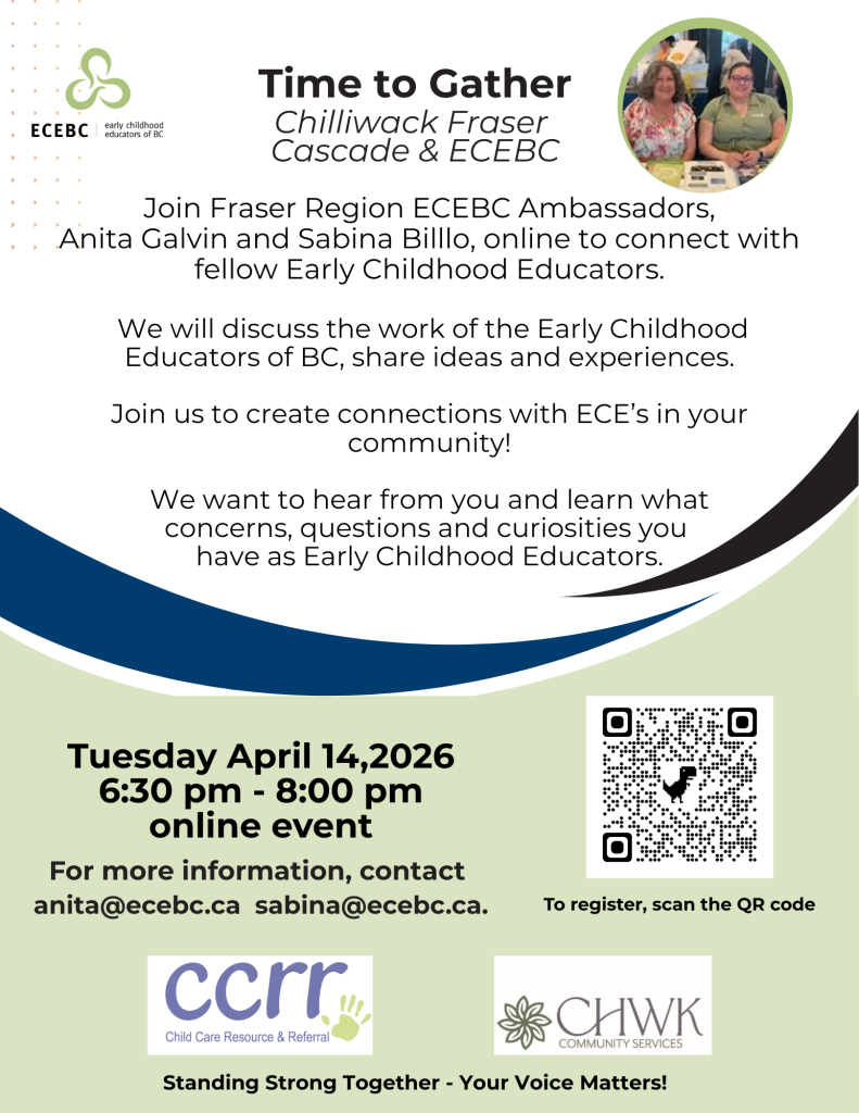 Chilliwack Fraser Cascade CCRR & ECEBC Time to connect with the ECEs in our community Discuss the work we do Share Ideas and experiences When & Where April 14th, 2026 – 6:30 – 8pm Online (Zoom event) Facilitated/Presented By: Anita Galvin & Sabina Billo Cost: Free REGISTER ONLINE