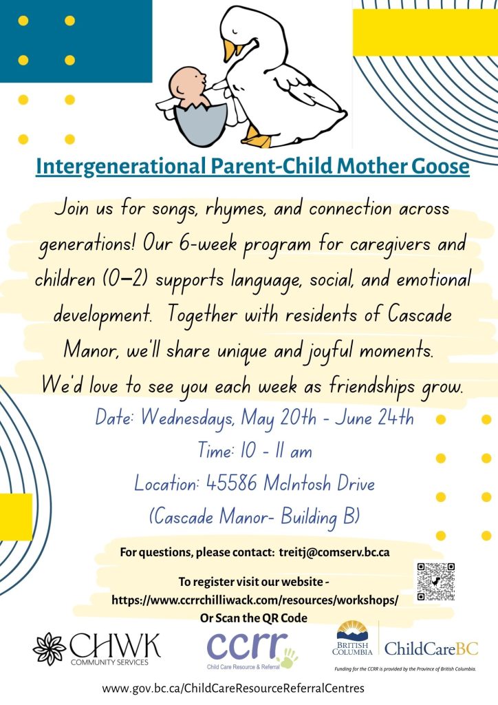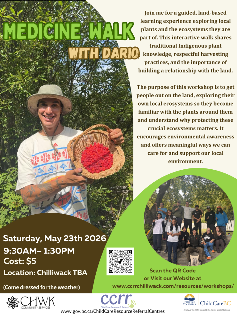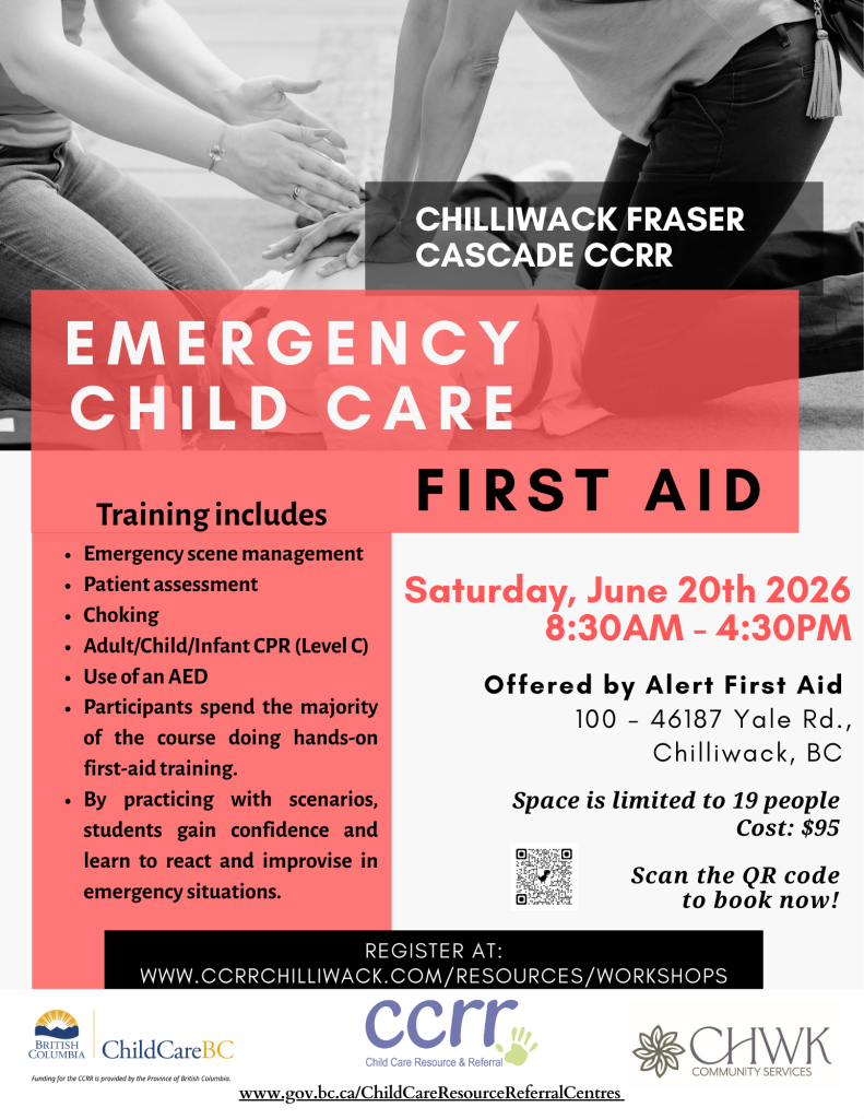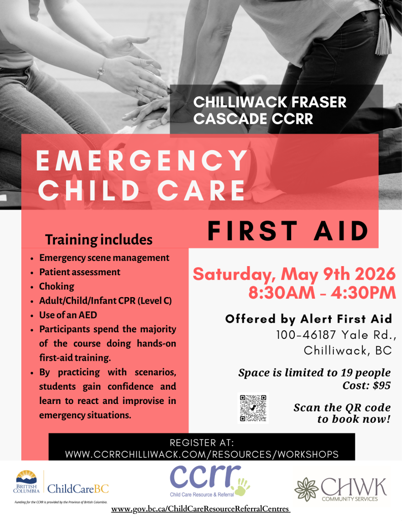 Do you need your first aid certification?We offer Emergency Child Care First Aid courses in person.Visit the Workshops tab on our website at: www.ccrrchilliwack.com or scan the QR code to reserve your spot now! Cost: $95 REGISTER ONLINE When and Where Location: 100 – 46187 Yale Rd, Chilliwack Date & Time – March 28, 2026 […]
